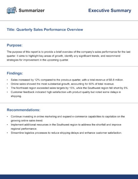 Also, using an executive summary template makes things easier to read and helps make sure the final draft follows industry rules. This can have a bigger effect on the people you want to reach. Whether you're writing a summary for a stakeholder or your boss, templates can make your work look better and more professional.