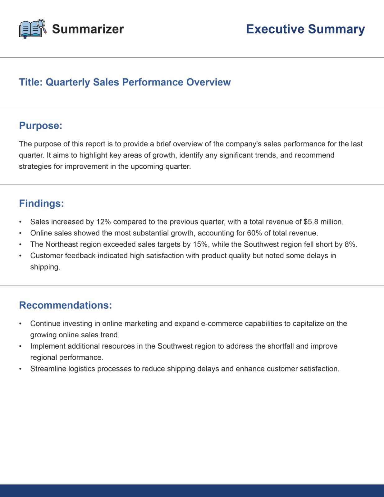 It is a concise and comprehensive overview that highlights the most important points of a larger document. An executive summary aims to give readers a quick look at the content, helping them make fast and well-informed choices.